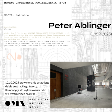 Być może przekonamy się o tym, słuchając ostatniego dzieła Petera Ablingera – napisanego specjalnie dla budynku NOSPR trzyczęściowego Momentu opuszczenia pomieszczenia. Wybitny austriacki eksperymentator kończył pracę nad szczególnym prezentem dla katowickiej publiczności, walcząc z odmawiającym mu posłuszeństwa ciałem. Peterze, mamy nadzieję, że będziesz tego dnia z nami. I z przyjemnością posłuchasz również osadzonego w hinduistycznej metafizyce Bhakti Jonathana Harveya oraz Posthumany, zamówionej przez Orkiestrę Muzyki Nowej u Cezarego Duchnowskiego z myślą o zupełnie innej, a zbliżającej się wielkimi krokami transcendencji.