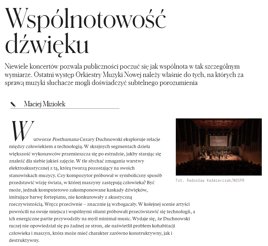 Jego najnowszy utwór Posthumana otwiera planowany cykl kompozycji poświęconych ideom posthumanizmu — nurtowi filozoficznemu, który podważa tradycyjny obraz świata. W centrum nie stoi już wyłącznie człowiek, lecz sieć współzależnych bytów: biologicznych, technologicznych i wirtualnych.